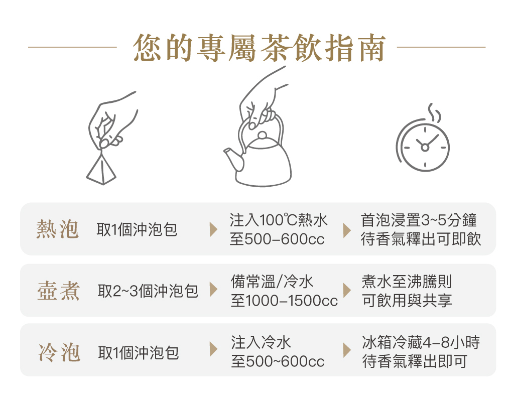 .熱沖冷泡都好喝:5 分鐘完成,每包可回沖 2–3 次。